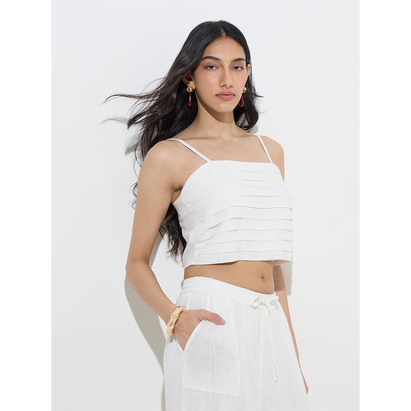 LOV brings you this white top designed with pintuck detailing at the front. Crafted from a lightweight linen-blend fabric, it includes a square neck with adjustable straps, while the smocked back lends a customised fit.