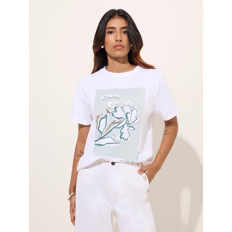 This white t-shirt by LOV is designed with a beautiful print. Made with pure cotton, it includes a round neck and half sleeves.
