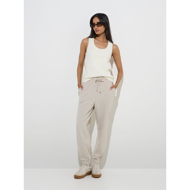 Keep it simple and stylish with this white top from LOV, detailed with beige borderwork. Woven from high-quality fabric, it features a round neckline and a sleeveless cut.