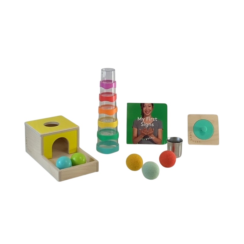 This play kit is designed for ages 7-8 months to strike your babies curiosity! This kit offers a variety of high quality toys that will make simple noises, stack, introduce new textures and so much more.