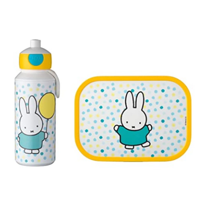 Complete lunch set for every school day. Also very handy for a day out or when playing sports. The lunch set consists of a pop-up bottle and a lunch box with bento box.All set for a new day at school with the lunch set Miffy Confetti from Mepal. This handy