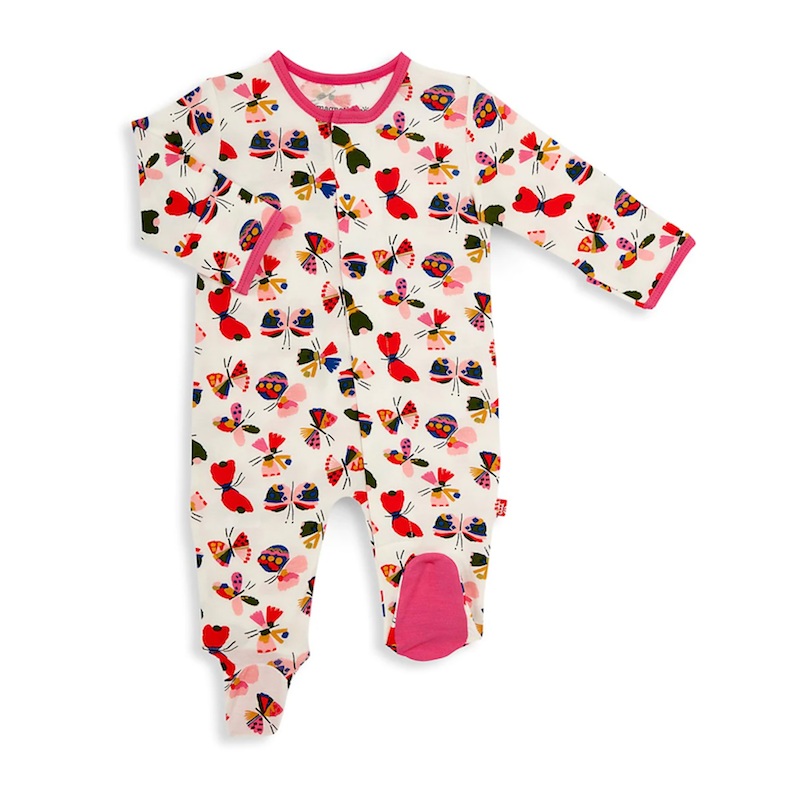 Introducing theMagnetic Me Flitter FlutterMagnetic Footie – Premie.A soft, stylish all-day and all-night wardrobe staple with smart magnetic fasteners that makes changing time painless. With our no over-the-head design, simply open the outfit, insert baby, and BOOM, DONE! – the footie practically closes itself. Machine wash as directed.
