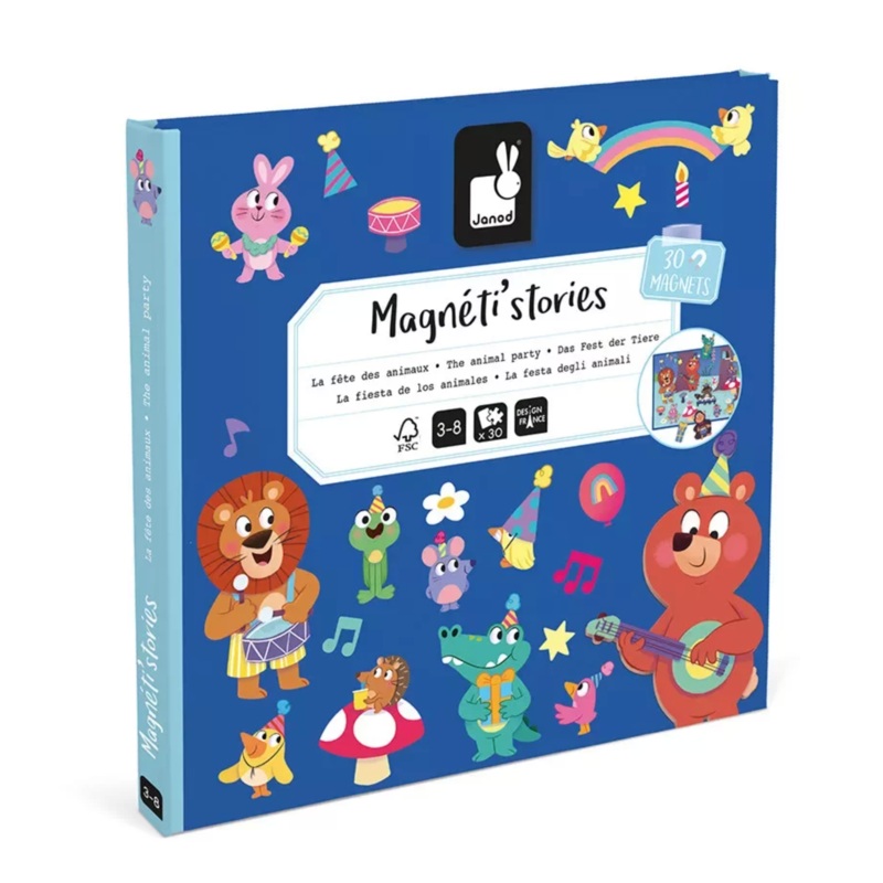 Come take a better look! Night has just fallen in the forest and a big surprise is in the making. This magnetic game will amaze children aged 3 years and up. The illustrated backdrop will help bolster your little one’s imagination and fine motor skills. In fact, this magnetic game consists of a large decorated board and 30 magnets. The magnets, once placed on the party-themed panorama, will become the starting point for many a wonderful story! All the animal guests are in position and the central cake has been lit with a candle, ready for the music to sound! After all, whose birthday are we celebrating? Thats up to your child to decide. This large background is foldable and can therefore easily be stored or slipped into your little one’s backpack. Theyll be able to invent a multitude of short stories whenever they like, whilst stimulating their fine motor skills as they move the magnetic pieces. Once all the elements are in place, all that remains is for children to stand the scene vertically and tell their story to their willing audience! This magnetic game is part of the large Magnti’stories collection which promotes daydreaming and imagination. This magnetic game is made from FSC-certified cardboard, in addition to controlled materials.