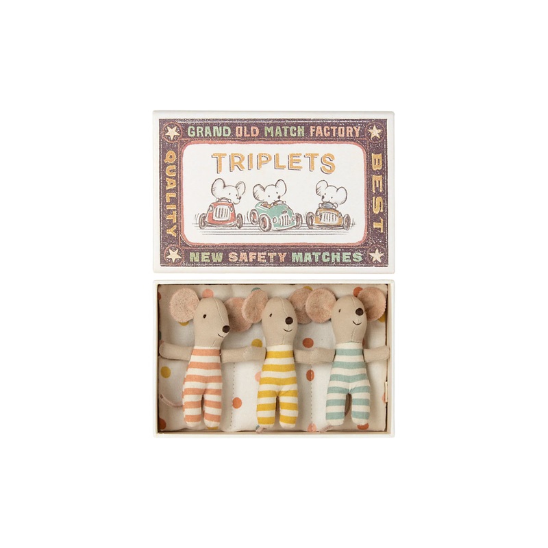 Surprise! It’s triplets!Not two, but three baby mice in a box!They cozy up together in their box to sleep and keep their mummy on her toes during the day. Dressed cute & complementary in stripes, they come cuddled together in blanketed pockets.