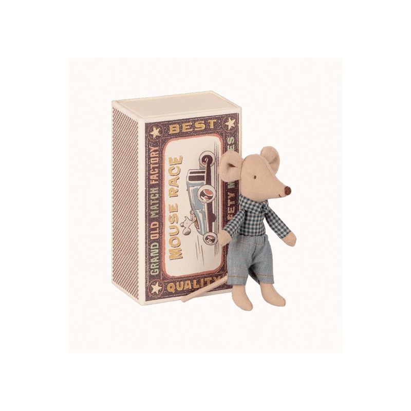 A classic Maileg item. This mouse is ready for hours of play and sleeps tight in a little matchbox. The clothes and bedlinen are made of soft fabrics with unique prints and beautiful colors. Bedlinen may vary in color.Size:Little sister/brotherHeight:3 in.Age:All ages