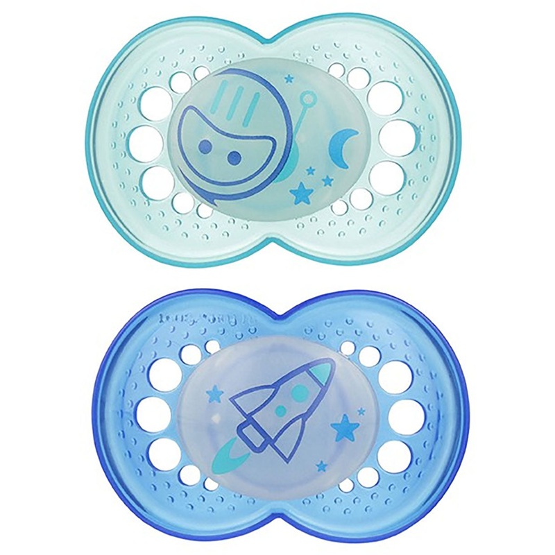 Designed to Keep Baby CalmMAM works closely with pediatric dentists and orthodontists to develop and design pacifiers for babies of all ages. Our pacifiers are anatomically correct, adapting to the baby’s mouth so the pacifier is always in the proper position. A curved shield, big air holes and an innovative inside surface all comfort baby and help prevent skin irritation. All MAM pacifiers also feature a soft silicone nipple that feels more like mom and an anti-slip surface that helps keep the pacifier in baby’s?mouth.Aquatic motifs with translucent shields