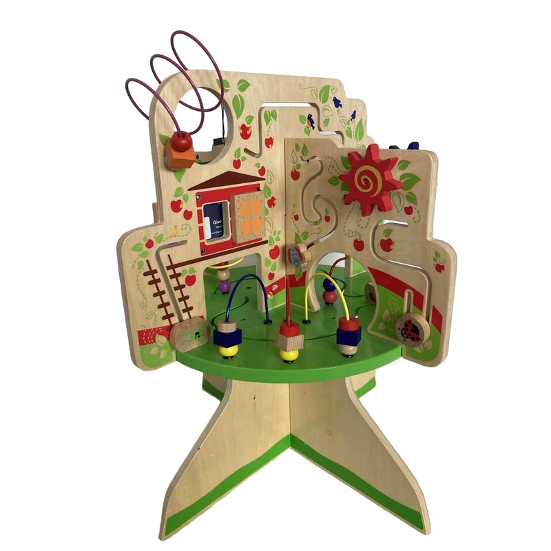 “This wooden activity center is packed full of exciting features! Includes 4 quadrants with a variety of activities: tracks with animal-themed gliders, bead runs with colorful wooden beads, a spring flower and more. This is sure to keep your little explorer busy for hours. “