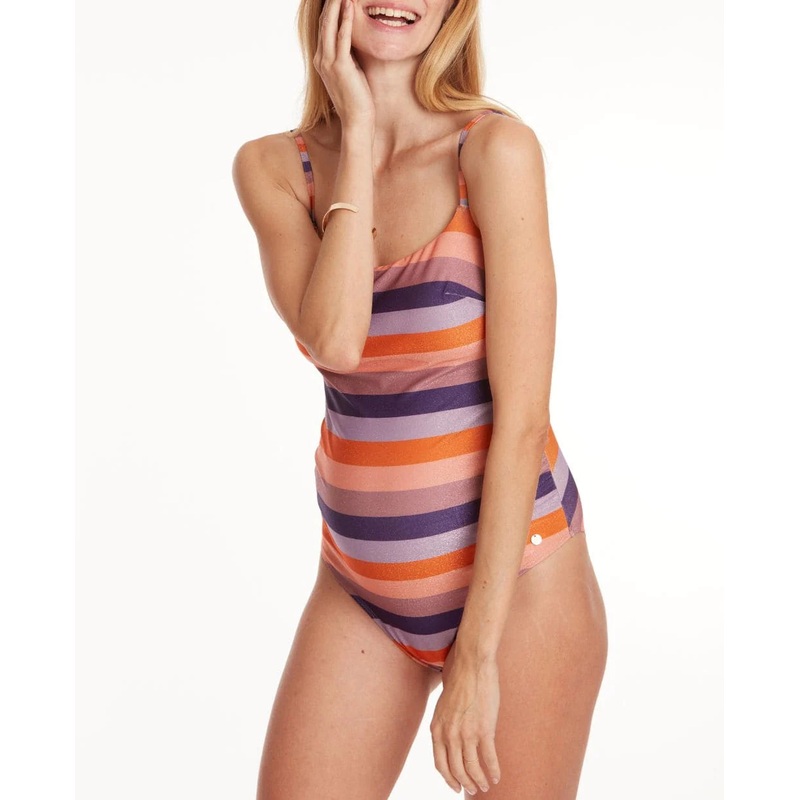 Lively and radiant,The Rainbow maternity swimsuitis ideal for a summer under the sign of color. The scratches, mix different tones of orange and purple, andIts touches of lurexBring an energetic and shiny touch to this colorful swimsuit.