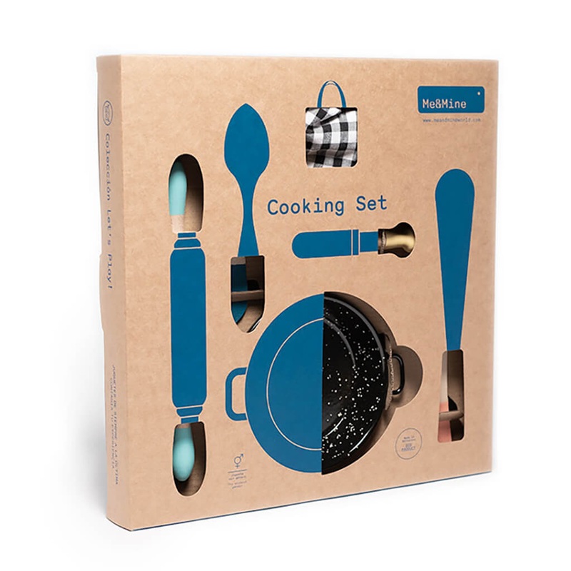 Inspire the creativity of cooking with this 6-piece kitchen playset! Inside, you will find a wooden spoon, spatula, rolling pin, and pestle, enamel mortar, and a fabric carrying bag. On the back of the packaging are 20 cuttable food shapes, ready to be colored in and used with the set.