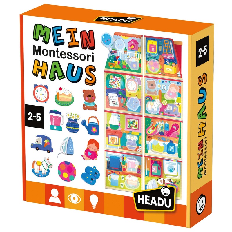 Mein Montessori Haus Alles an seinen Platz!Gestalte und dekoriere dein eigenes Haus! Mit diesem Superspiel lernt ihr Kind, Objekte einzuordnen, Formen zu erkennen und sie an der richtigen Stelle einzusetzen. Das Montessori-Spiel hilft Kindern ihre eigene Persnlichkeit und Eigenstndigkeit entdecken, ihre taktilen Fhigkeiten zu frdern, Formen zu erkennen und Gegenstnde zuzuordnen.Ein wunderbares Lernspiel von HEADU fr Kinder von 2 – 5 Jahren.Artikel: DE23196Inhalt: Haus mit 6 Zimmern, 30 Formen zum Einsetzen