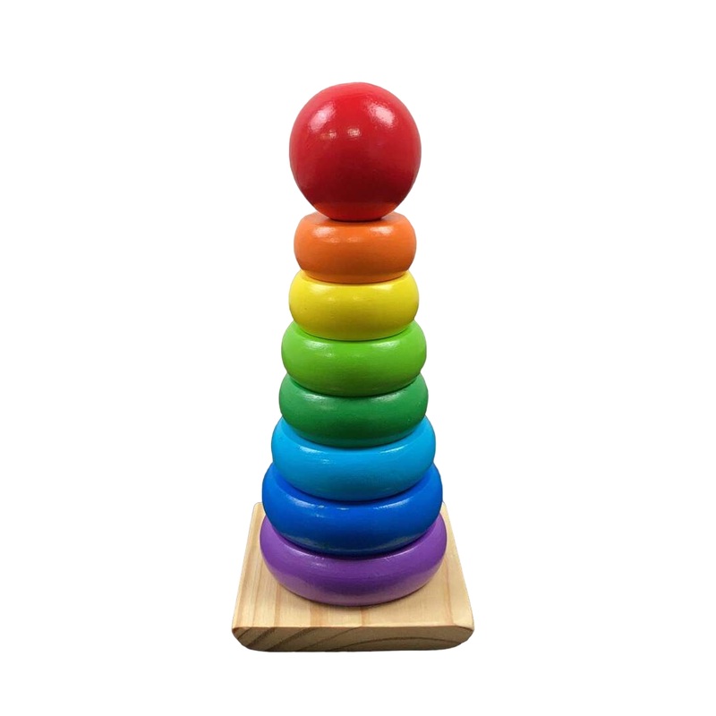 “Talk about a classic childhood toy! All the colors of the rainbow are represented by these eight smooth, easy-grasp wooden pieces. Stack them on the solid-wood base, designed with rocking edges for safe and intriguing play.”