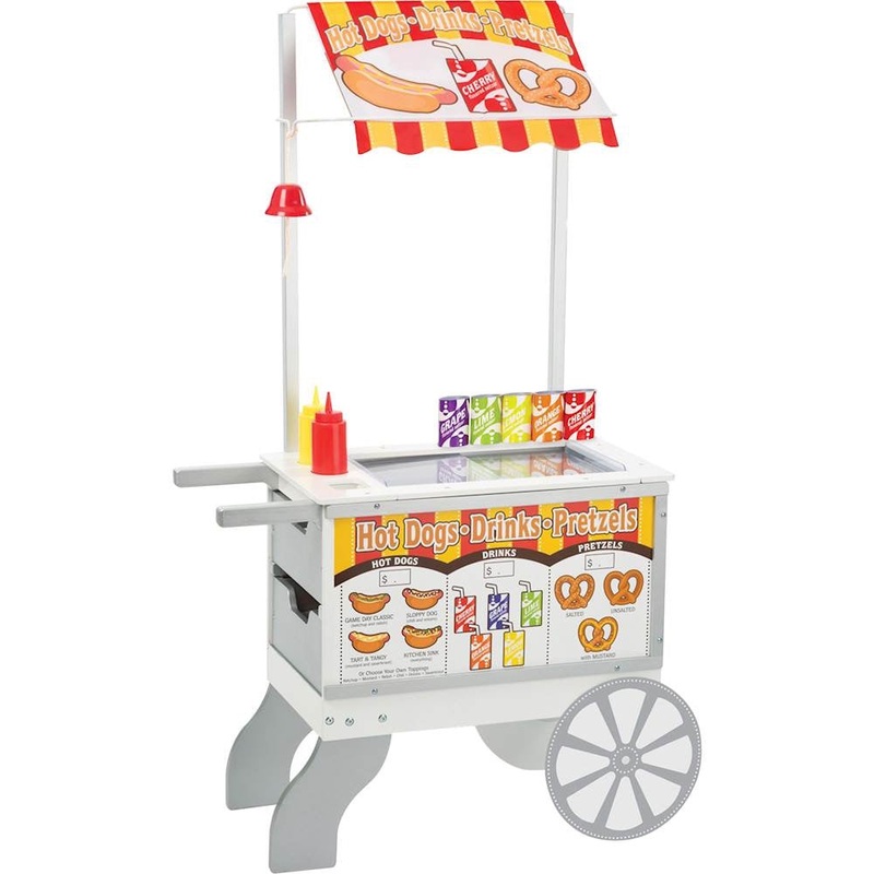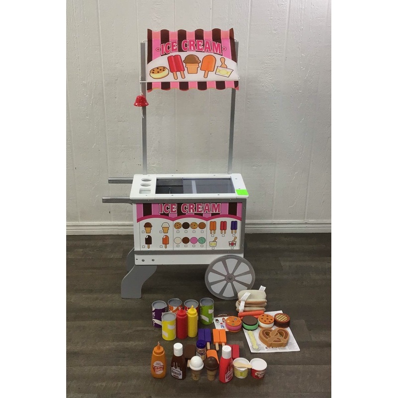 - Rolling, reversible ice cream and hot dog cart with sturdy wooden construction