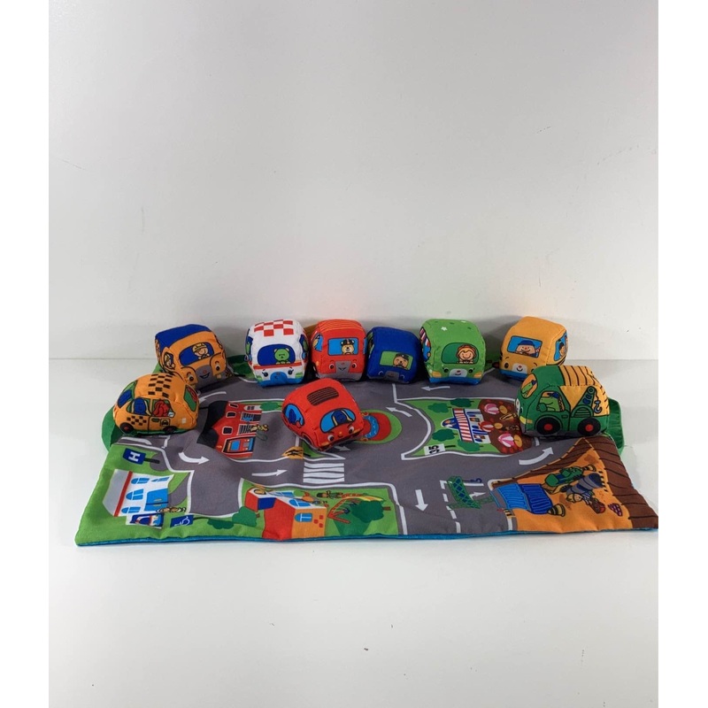 Condition: Gently Used "Take the fun along with you with this versatile, colorful play mat and vehicle set! The mat, with a non-skid backing, features an illustrated town and road scene in bright, eye-catching colors. The nine soft fabric vehicles crinkle,