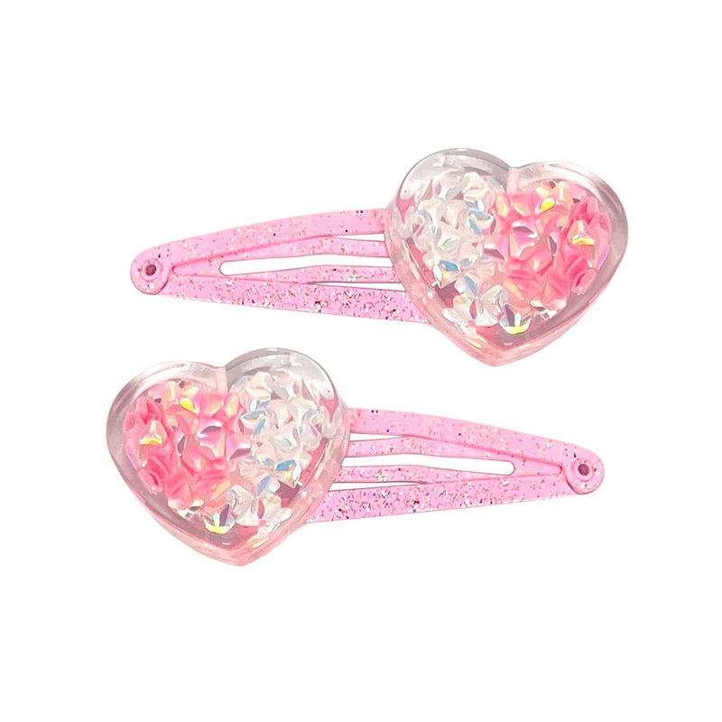Brighten your day withPink Poppy’s Mermaid Heart Hair Clips. These beautiful glittering snap clips are accented with 3D resin shaped hearts with 2 tones of glittery iridescent glitter shapes inside. The popular snap clip style hair clips are soft, comfortable and easy to wear.