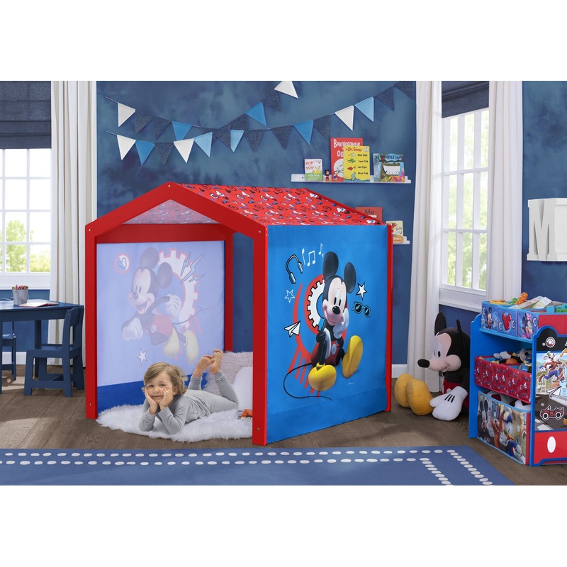 Oh boy! Kids can create their very own Clubhouse with this Disney Mickey Mouse Indoor Playhouse with Fabric Tent by Delta Children. The durable wood frame is draped in colorful tent fabric that features bold graphics of everyones favorite mouse, Mickey. A magical fort for boys and girls to play or read, it’s designed to enrich imaginations and encourage kids to create a whole make-believe world inside–decorate the inside of the playhouse with a table, stuffed animals, throw pillows, blankets and more! This large wood playhouse stands just under 4 feet tall, and its sturdy construction ensures your child will make this a special place for creative play for years to come! Roomy enough for multiple children. Designed for indoor use only.