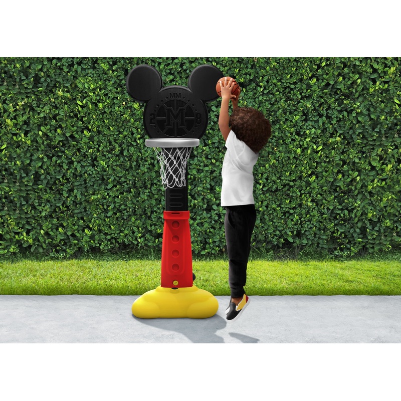 This Disney Mickey Mouse Plastic Basketball Set by Delta Children will be a slam dunk with your little Mouseketeer. A fun way to introduce kids to the game of basketball, Mickeys iconic silhouette at the backboard ensures theres always a friendly face, no matter how competitive the game gets. It will help toddlers and preschoolers develop social, motor skills and coordinationkids will work on their gross motor skills as they run and shoot the basketball and practice fine motor skills and hand-eye coordination as they try to control the basketball. The height can be adjusted seven settings between 4 and 5 feet to accommodate all ages and skill levels. In addition to basketball, kids can play with the included ring toss game at the back of the basketball hoop or use the height chart to see their growth. Use inside or outside. Before play, add sand or water to the base for stability. Includes basketball and hand air pump.