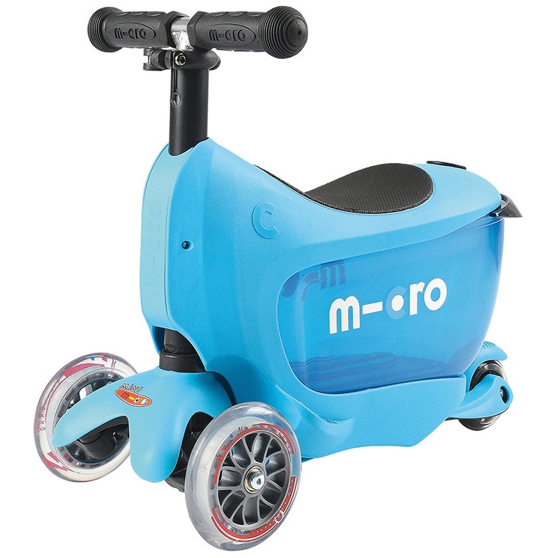 The Mini2Go Deluxe is the award winning ride-on and scooter for ages 18 mo+ that grows with your child, converting to a stand-up scooter with T-bar. Whether cruising around the playroom or outdoors at the park, your toddler will love playing with the Mini2Go drawer, designed for carrying his or her most precious possessions. The Mini2Go has the same lean-to steering as Micro’s other kickboard style products, which children learn intuitively, developing balance and coordination as they go. The non-marking wheels enable it to be used indoors and out. The toy drawer is removable, for those times when toys need to be left at home. Removing the seat AND drawer converts the Mini2go into a stand-up scooter, with a T-bar that is adjustable from 14″ to 24″, and a back spoon brake.