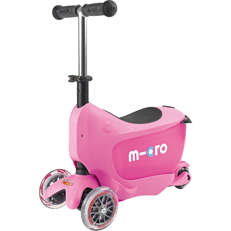 The Mini2Go is Micro’s new award winning ride-on and scooter for ages 18 mo+. Whether cruising around the playroom or outdoors at the park, your toddler will love playing with the Mini2Go drawer, designed for carrying his or her most precious possessions. The Mini2Go has the same lean-to steering as Micro’s other kickboard style products, which children learn intuitively, developing balance and coordination as they go. The non-marking wheels mean it can be used indoors and out. The toy drawer is removable, for those times when toys need to be left at home. Removing the seat AND drawer converts the Mini2go into a stand-up scooter, with a T-bar that is adjustable from 14″ to 21″, and a back spoon brake.