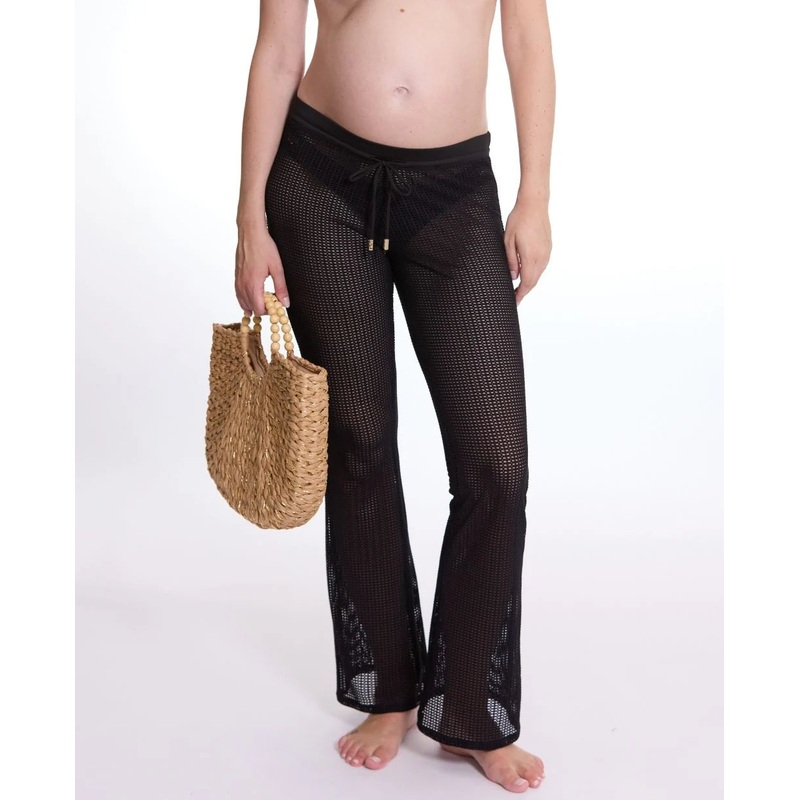 Opt for the Milos maternity pants, the perfect combination of comfort and bohemian chic style. Its lightweight crochet mesh, made of recycled fibers, its flare cut and its adjustable belt make it the ideal piece for your summer beachwear outfits.