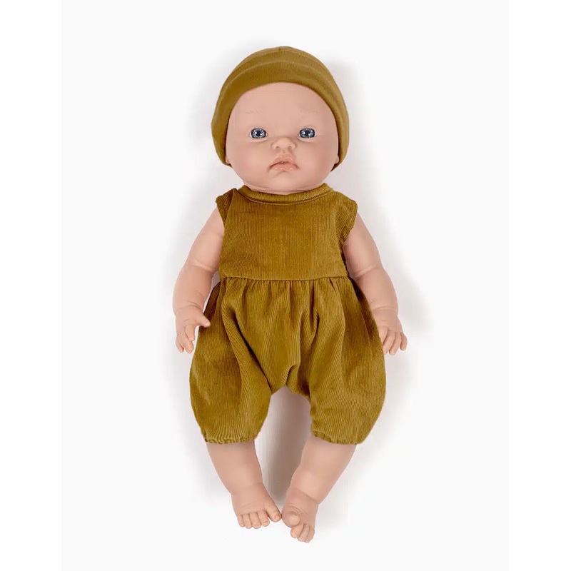Igor, the 36cm Minikane baby doll with piercing blue eyes, is adorably dressed in a Noa romper made of soft milleraies velvet and a stylish Tico hat in Havana jersey.