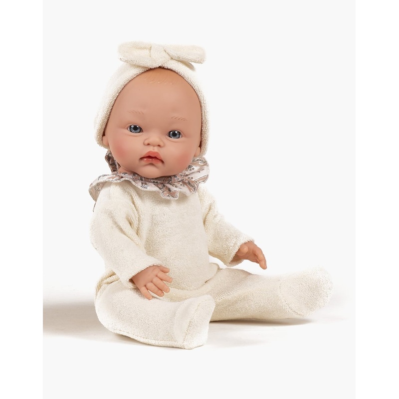 Introducing the adorable Minikane Iris doll, dressed in a cozy terry cloth sleepsuit with a cute collar and matching headband. With bright blue eyes, Iris is sure to capture your heart and inspire your imagination.