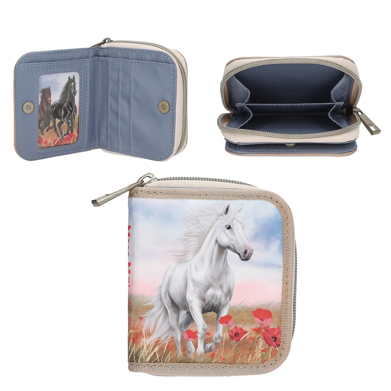 Das beigefarbene Portemonnaie von Miss Melody ist wie ein wahr gewordener Pferde- Traum: Auf der Front ist ein tolles Motiv von einem weien Pferd in einem Feld voller roter Mohnblumen. Innen ist das Portemonnaie in schlichtem Rauchblau gehalten. Mit geteiltem Reiverschluss-Fach fr Mnzen, einem Fach fr Scheine, diversen Kartenfchern sowie einem Namenskartenfach mit transparentem Fenster. Mae: 10 x 12 x 3 cm ( L(B/H)Altersempfehlung: 6 JahreMaterial: 100 Prozent Polyester