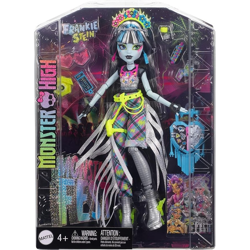 • Monster High Frankie Stein doll scored a ticket to Monster Fest, the coolest music festival around! With a blinged-out lurk and voltageous accessories, they can’t wait to eat, dance, and be scary!