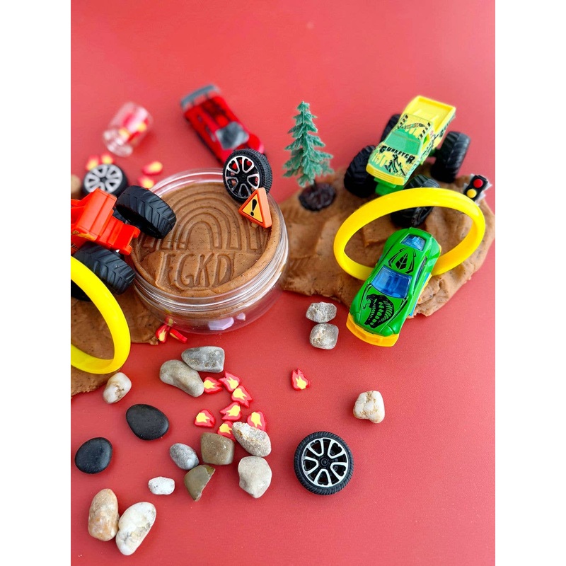 Rev your engines and use your monstrous dough-magination with the Monster Truck KidDough Play Kit! Includes 8 oz Textured Brown (Root Beer) KidDough, Monster Truck, Tires, Tree, road signs, drive-through ring of fire, jar of fire fimos, crash car, and Natural Rocks. Our super silky sensory doughs are buildable like a modeling compound but are softer, more pliable, and far longer lasting than any compound you have tried before! Every all-natural KidDough is made with non-toxic food grade ingredients and is totally taste safe. KidDough is the best way to play dough! This Play Kit is recommended for Ages 3+