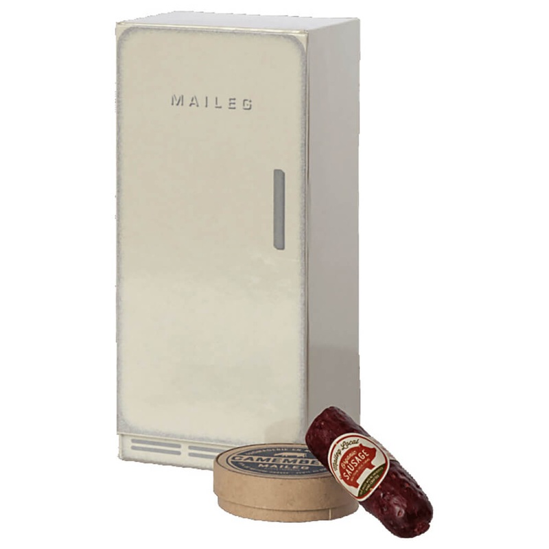 The perfect place to store your Mouse friend's groceries so they stay fresh and cold. Includes a small sausage and cheese.Age: 3 years+Material: Metal/PolyresinDimension: H 5 x W 2 inches