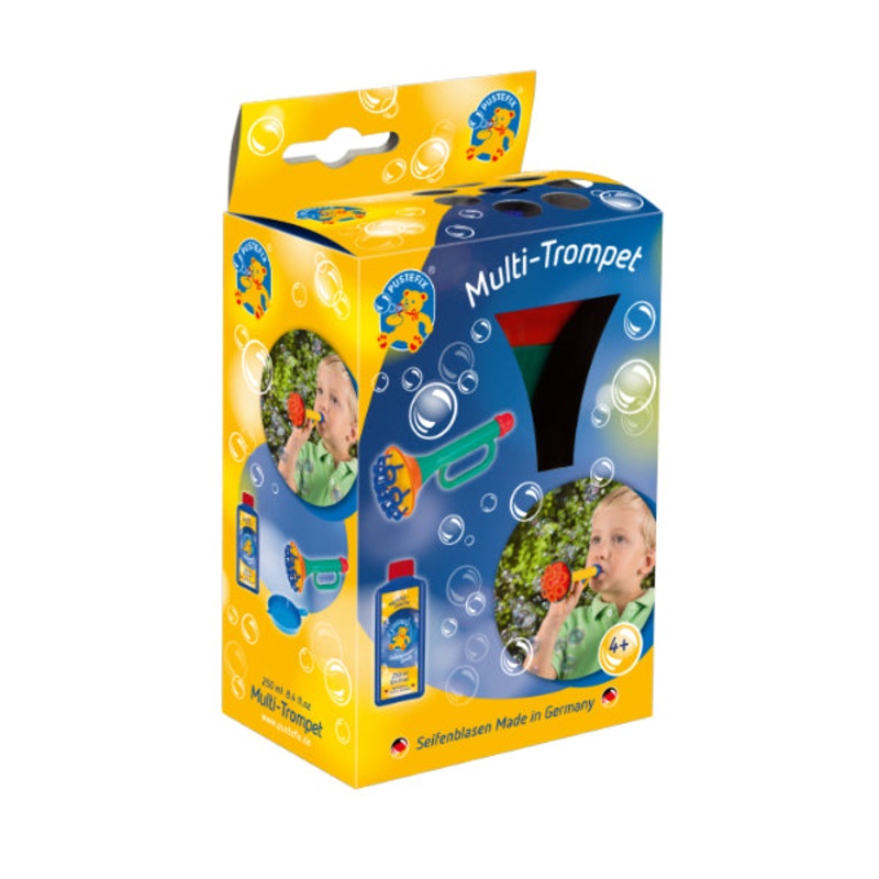 The bubble kit includes 8.3 oz of Pustefix bubble formula, a bubble tray and the amazing Multi Bubble Trumpet.