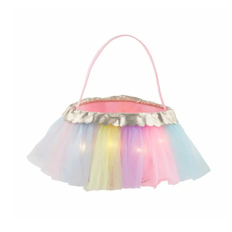 Nothing makes trick-or-treating more fun that our Light-Up Rainbow Tutu Halloween Bag. The felt treat bag features a light-up glitter mesh and tulle tutu skirt. Batteries are included in this set, to allow the Halloween treat bag to light up for your trick-or-treating adventures.