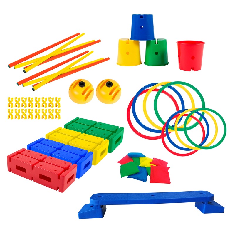 The different elements of this set allow you to set up an obstacle course and to work on different motor skills: balancing, jumping, crossing, targeting, tossing…