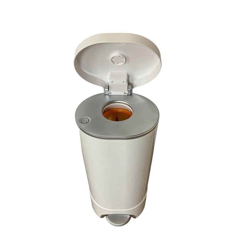 “Keep your nursery smelling fresh with this handy diaper pail that locks odors inside with Arm and Hammer control. Works with rings.”
