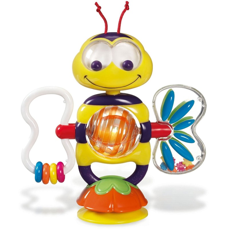 This toy is the bees knees! This colorful creative toy offers endless play possibilities. Make the head bobble up and down, spin the wings, roll the belly and listen to all the different sounds. The durable suction cup base keeps it secure when you set it on a high chair or table top. Or you can remove it from the base and use it as a hand-held activity toy. No matter how you play with it, this interactive bee is a real honey!
