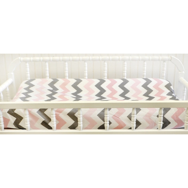 Inspired by the popular chevron pattern, our Chevron Baby in Pink Collection will give your nursery a modern, clean look. Crisp white, gray & pink lends a fresh feel to your new babys room. Chevron in Pink and Gray contour changing pad cover. Elastic band