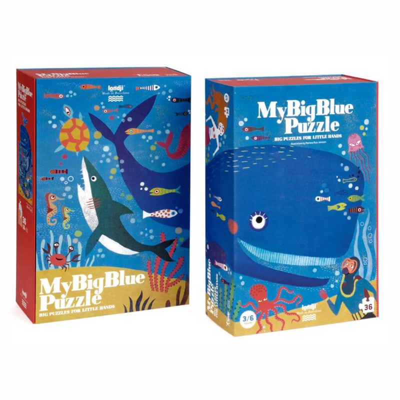My Big Blue Puzzle is a colorful shape puzzle that depicts a friendly whale. 36 pieces fit together to show the whale breaching the surface and the detail of the hidden depths of the ocean beneath.