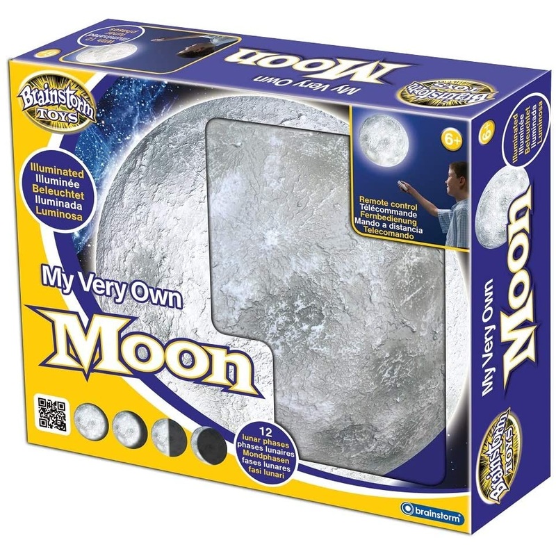 Bring the moon into your own room withMy Very Own Moon from Brainstorm Toys. This authentically detailed model of the moon is designed to hang easily on your wall like a picture and the realistic moonscape shines moonlight just like the actual moon. Use the remote control to automatically scroll through twelve illuminated lunar phases or use the manual function which allows you to set your own moon to look just like the moon outside from a new moon all the way to a full moon. The moon also includes an auto shut-off mechanism after 30 minutes to preserve battery life, making this item perfect for bedtime. It is really easy to set up and no mains electrics are required, it is powered by just 4 x AA batteries in the moon and 2 x AAA batteries in the remote. You can also read fascinating information about the moon online by using the secret code supplied in the pack. This detailed moon makes a stunning room accessory or a reassuring night light.