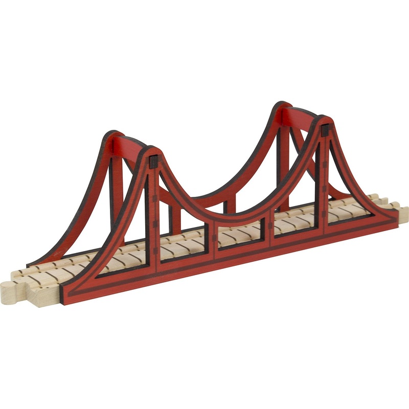 Create your own San Francisco Bay area with our simple suspension bridge. Bridge can lay flat on the track table or it can span a distance when used in conjunction with bridge set track. Our Suspension Bridge measures 12.7″ long by 3.7″ tall, constructed of high quality birch plywood sides affixed to a 12″ piece of track. 2.6″ tall bridge opening is high enough to accommodate our NameTrains letters. Compatible with our and other wooden train sets.