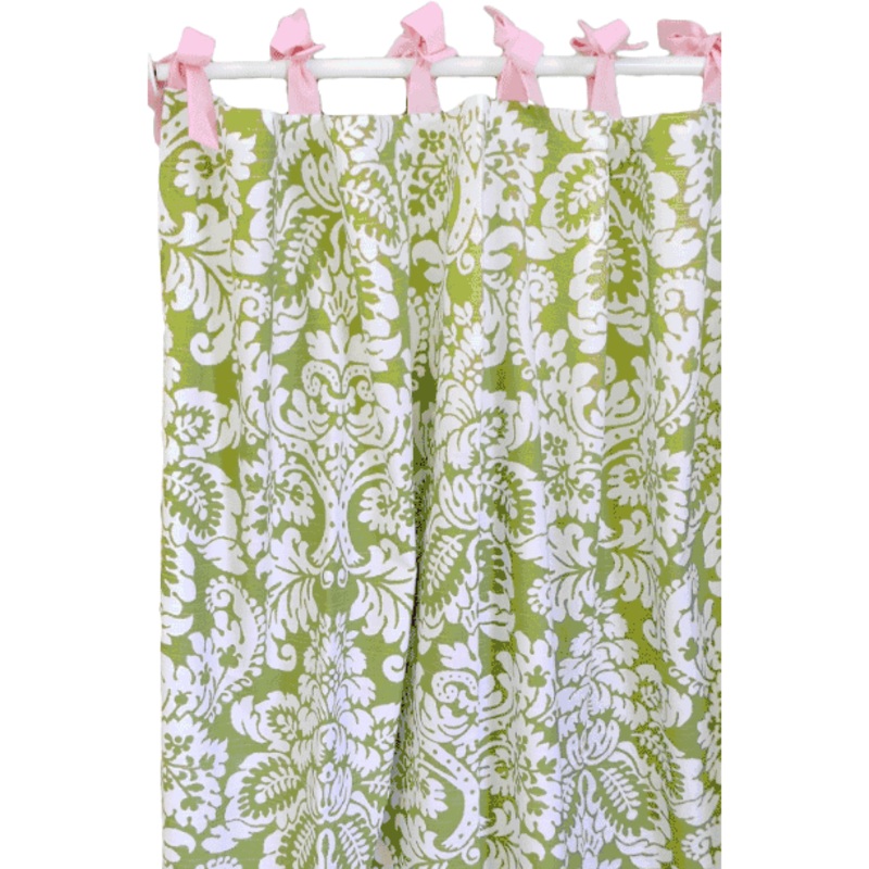 Our Bloom in Apple Baby Bedding creates a chic and sophisticated look using damask print and pink and green colors. Curtain panels are 52" wide by 84" long.