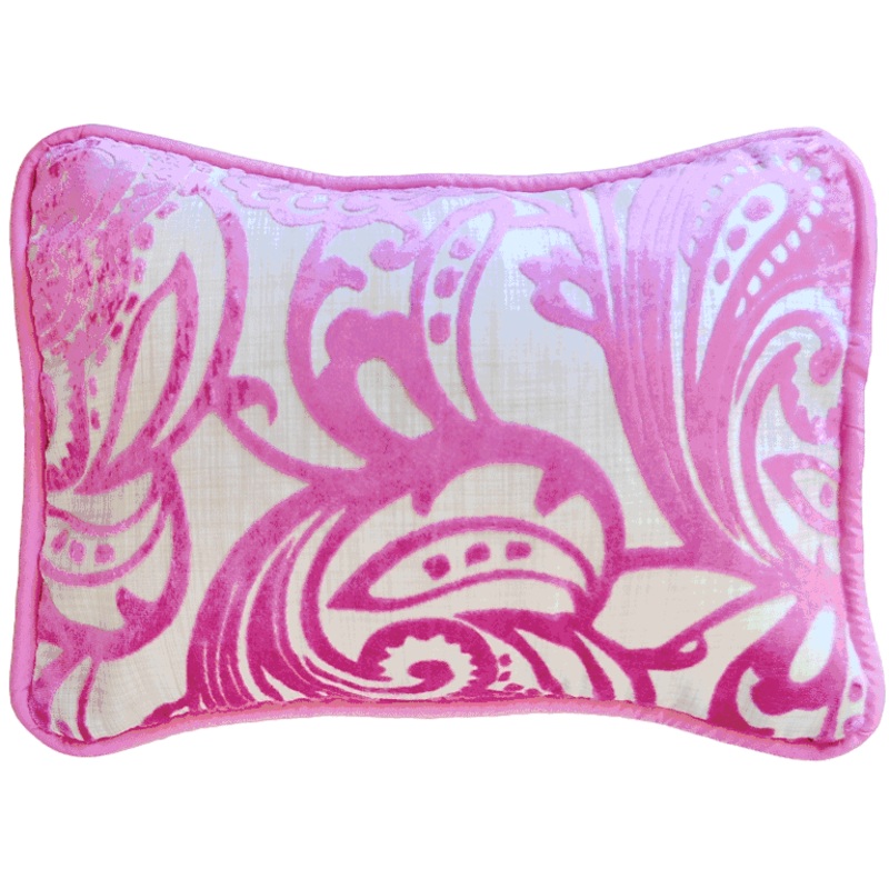 French Quarter Throw Pillow is made from Hot Pink Velvet Damask fabric with Perfectly Pink Solid cording. Dimensions: 16″ x 16″.