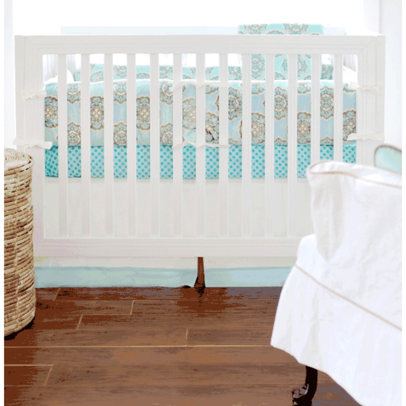 Our new Ocean Avenue baby bedding is one of our most beautiful sets yet! Unique and calming, this neutral nursery bedding will work well in any little boy or girls nursery. The two piece set includes a crib sheet and skirt. The sheet is also made from Cotton Sea Polka Dot. The 17″ tailored skirt is made from our Taffeta in Cream fabric with a Taupe Poplin pleat & Aqua Solid band.