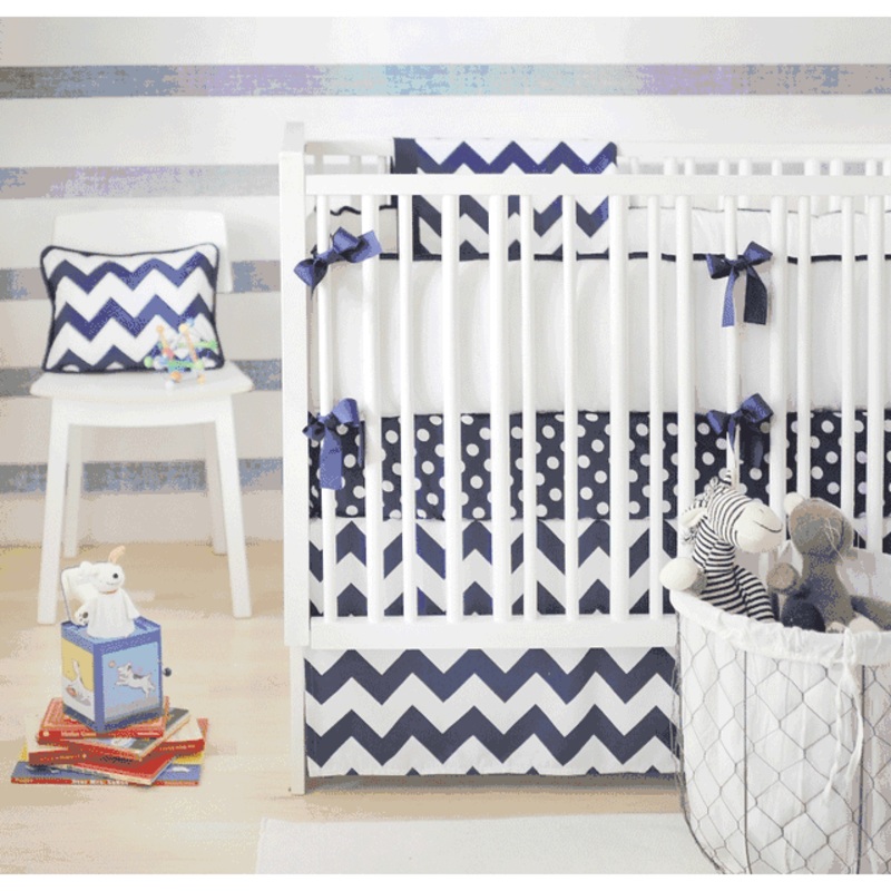 Inspired by the newly popular chevron pattern, our Zig Zag Baby in Navy Crib Bedding will give your nursery a modern, clean look. Crisp white & navy lend a fresh feel to your new baby’s room. Zig Zag Baby in Navy three piece set includes bumper, sheet and skirt. The bumper is made from White Pique fabric and navy cording with Navy Grosgrain ribbon ties. Bumper is slip covered for easy cleaning. The sheet is made from Polka Dot in Navy fabric & the 17″ tailored skirt is made from Big Zig Zag in Navy.