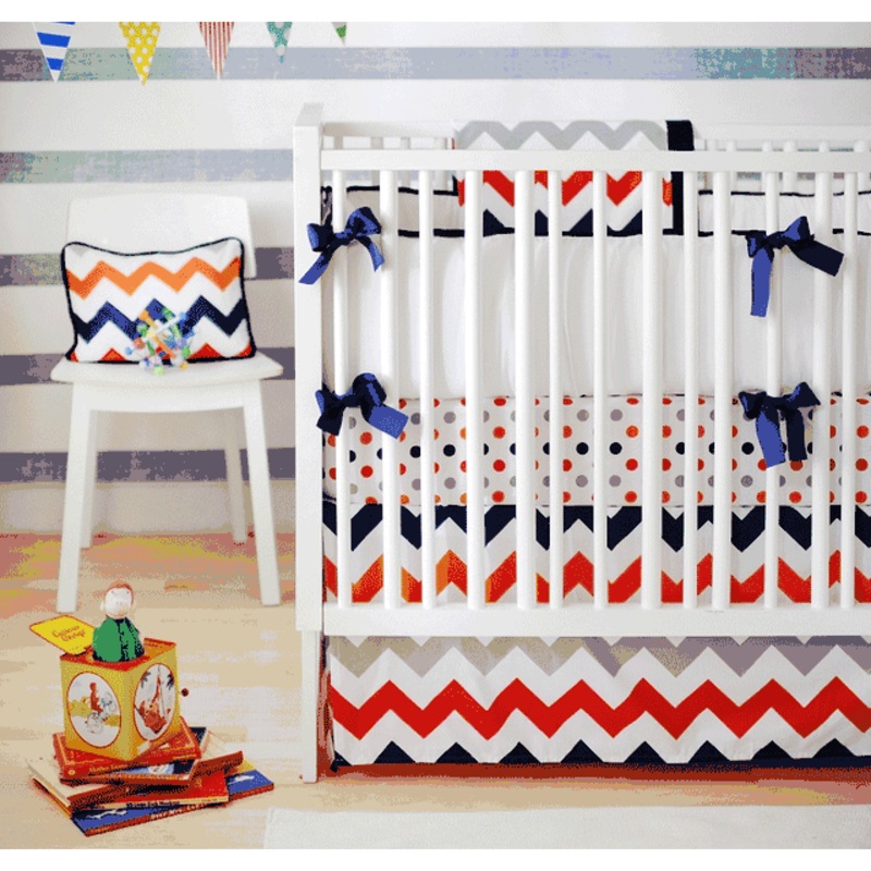 Inspired by the newly popular chevron pattern, our Zig Zag Baby in Rugby Crib Bedding will give your nursery a modern, clean look. Crisp white & bright boy colors lend a fresh feel to your new baby’s room. Zig Zag Baby in Rugby three piece set includes bumper, sheet and skirt. The bumper is made from White Pique fabric and navy cording with Navy Grosgrain ribbon ties. Bumper is slip covered for easy cleaning. The sheet is made from Polka Dot in Rugby. The 17″ tailored skirt is made from Big Zig Zag in Rugby.