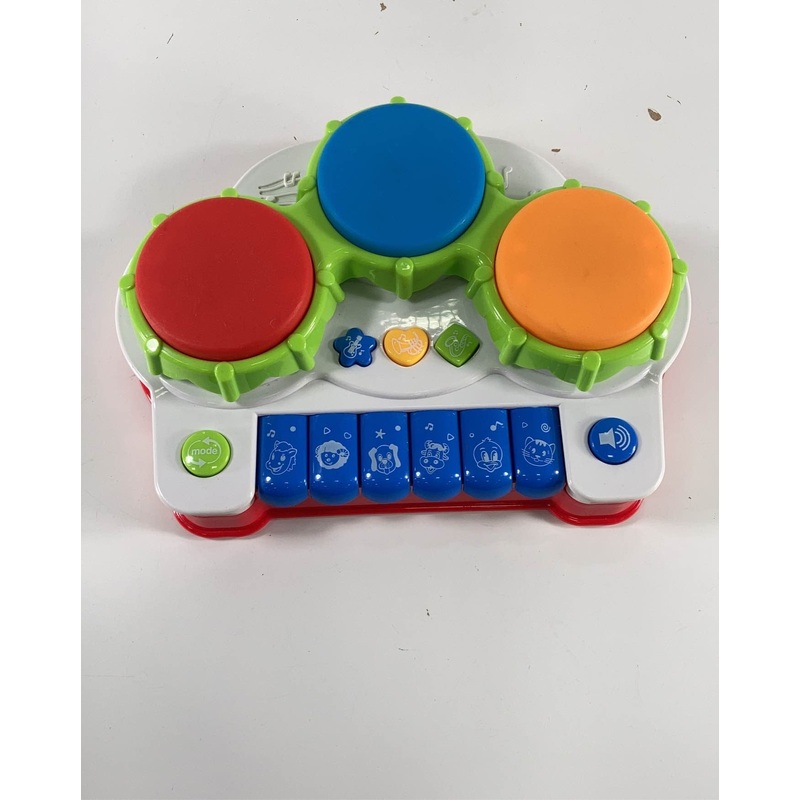 “Little musicians will enjoy playing the drums and pounding the piano keys while watching the lights flash with this fun musical toy.”
