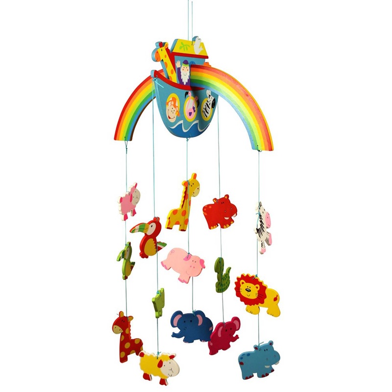 This enchanting Noahs Ark wooden mobile is perfect for nurseries, playrooms or bedrooms. At the top of the mobile is a colourful rainbow, below which floats Noahs ark which is still taking passengers: a host of familiar animals are waiting to board.