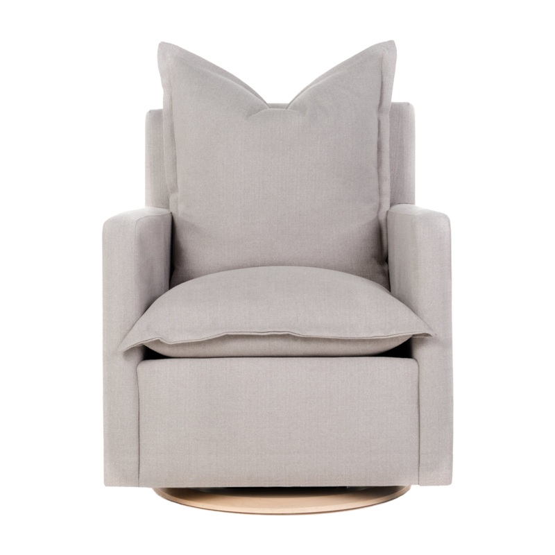 With removable, plush cushions, our Nola Swivel Nursery Glider has a full 360 swivel motion and parallel rocking motion that gently glides, allowing you to easily turn toward anything you might need to reach. The Nola glider features removable cushions, with cushions made from a luxurious down alternative so you get that sinking-in filling when you sit in your chair. Embrace style, comfort, and sophistication!