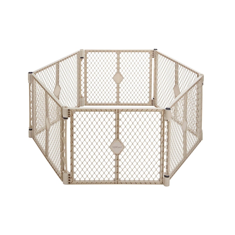 “An excellent way to keep kids (or pets) safe indoors or out. The 6 panels set up quickly without tools and folds compact for storage. This fenced in space provides 18.5 square feet of play area, 26 high.”