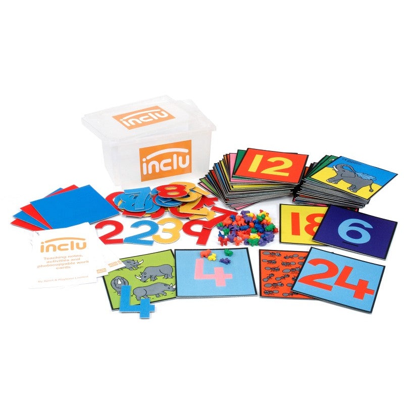Set contains 24 number tiles, 24 counting tiles, 30 jumbo numbers, animal counters and 4 blank tiles. Also includes notes, work sheets and storage box.Small parts- choking hazard.Age: 3 years +