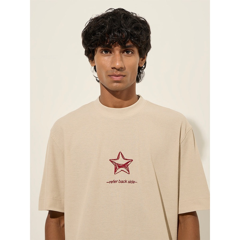 This beige t-shirt from Nuon features drop shoulder sleeves, a standout front star graphic and bold back print. Crafted from soft, breathable fabric, it offers a relaxed vibe and is perfect for casual outings.