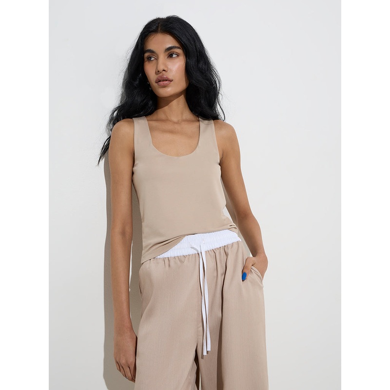 This beige tank top by Nuon is milled from an ultra-lightweight fabric for a comfortable fit. Featuring a classic scoop neck and a sleeveless cut, its a versatile essential perfect for layering or styling solo.